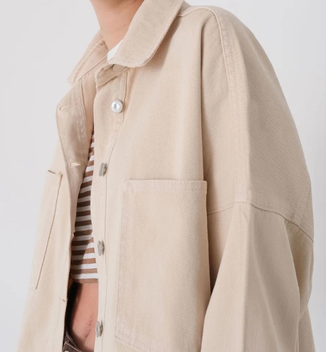 Öne bakan şekilde omuz dikişi ve rahat kesimli olarak üretilmiştir. Arka kısmı robalı olup gömlek yakası görünümüne sahiptir. Önden düğmeleri bulunur ancak astar eklenmemiştir. Ayrıca manşetlerinde de düğmeler bulunmaktadır. Göğüs ceplerinde kapak yoktur, açık cep tarzındadır. %100 pamuktan üretilen ceketin bedeni standart olarak üretilmiştir. Ham düğmeli oversize ceket farklı renk seçenekleri ve gömlek ceket görüntüsü ile kombininizi tamamlayacak olan parçadır.