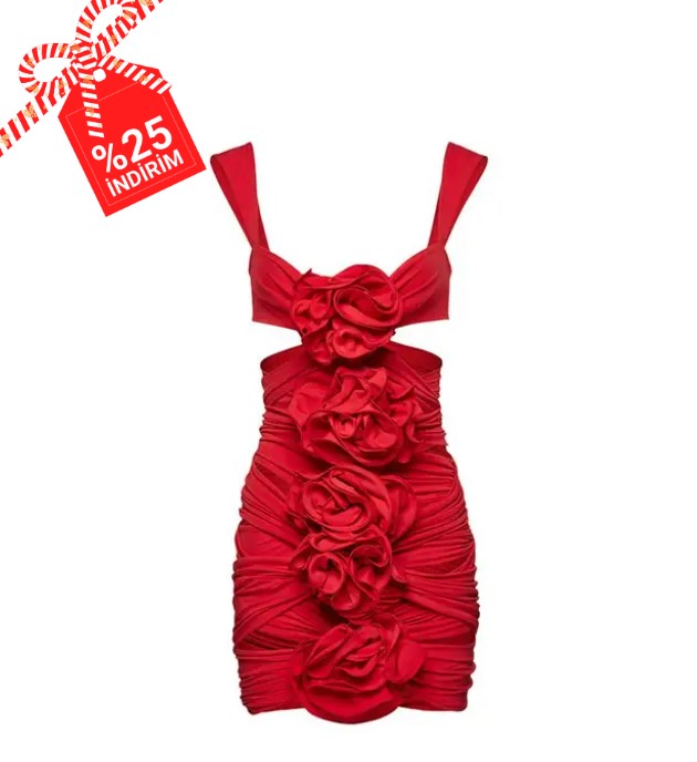 Kırmızı Viskon kumaştan üretilen özel tasarım bu elbise; orta şerit boyunca kumaştan yapılmış kırmızı güller ile fırfır izlenimi vermiştir. DCEY’in en mükemmel ve iddialı tasarımları arasında yer alan bu model; önden ve yandan kesikler ile oluşturulan yırtmaçlar sayesinde olağanüstü bir görüntüye sahiptir.