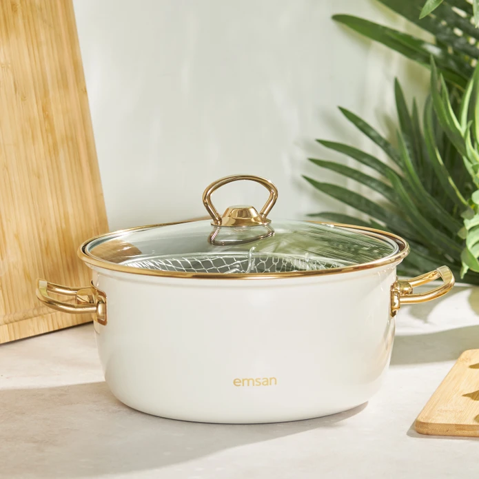 Emsan nostalji emaye bej kızartma tenceresi, mutfakta nostaljik dokunuş arayanlara özel ürün. 22 cm genişliğindeki tencere, sağlam emaye gövdesiyle dayanıklılıkla uzun ömürlü kullanımı garanti ediyor. Titanyum kulp detayı, kullanıcıya sağlam kavrama imkânı sunarken cam kapak sayesinde pişirme işlemi gözlemleniyor.