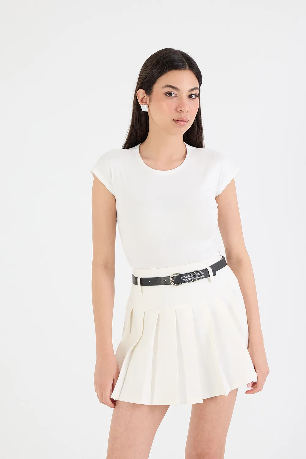 Göz alıcı ekru kemerli pileli mini etek normal bel yapısı ve zarif kemeri ile modern bir şıklık sunuyor. Yan fermuar detayı, giyip çıkarmayı kolaylaştırırken kalın pileli tasarım eteklere hacimle hareket katıyor.