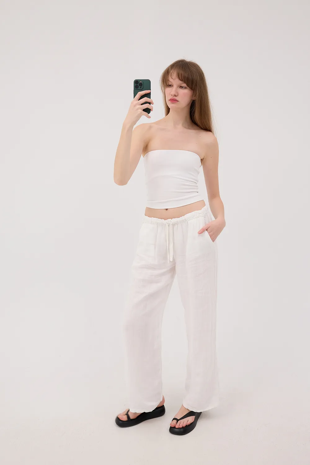 Belden bağlamalı keten pantolon, her adımda rahatlık sunan şık ve konforlu seçenek. Bel kısmında yer alan bağlama detayı ve lastikli yapısı sayesinde mükemmel uyum sergiliyor. Yandan cep tasarımı, pratik kullanımın yanı sıra modern görünmesini sağlıyor.